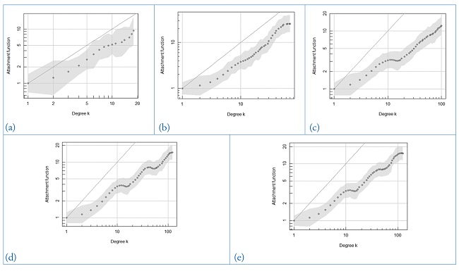 Specifically, the method calculates the attachment kernel (Ak) between two evolving networks, each corresponding to an expanding window. Ak is a function that indicates the probability of an actor to form relationships based on its degree. If the results of Ak assume values that are “an increasing function of average” (Pham et al., 2015, p.2), it is said that the actors that have accumulated more relationships are likely to build more relationships than the actors that have fewer ones. In other words, the closer Ak (in fact, the Ak log-linear) is to 1, the stronger preferential attachment affects the network evolution. In a personal communication (e-mail dated 23/11/2016), Pham points out that exponents superior to 0.5 indicate a strong preferential attachment. Due to space constraints, we refer the reader to the original papers for a thorough discussion of PAFit.