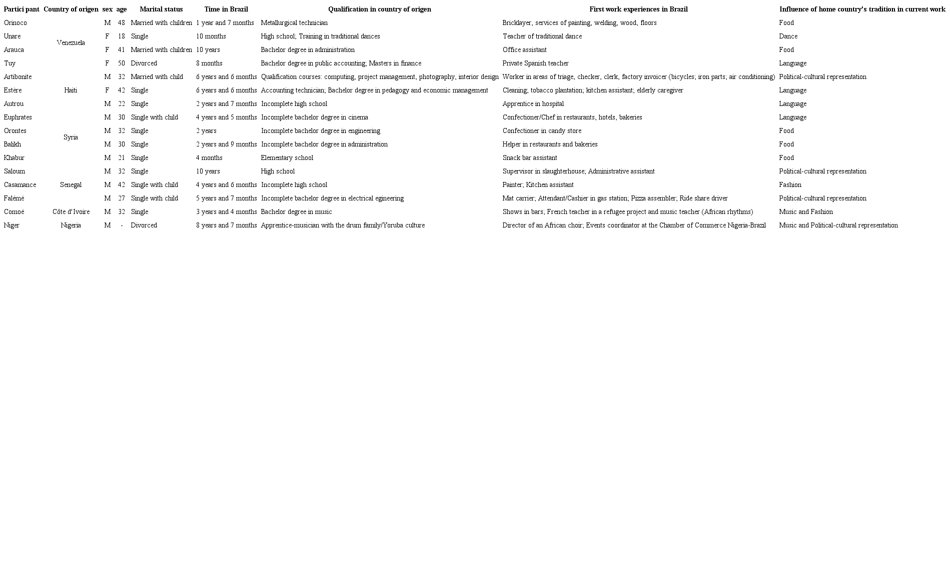 During these first parts of research, twenty potential participants were identified and invited to contribute. Four of them did not agree to participate in the interviews or offer the opportunity to know their work. Therefore, 16 economic migrants and refugees participated in the research, active participants in the events-activities or indicated by key informants, regardless of gender, with the following characteristics: (i) natives of countries in the global south; (ii) migrated to Brazil in a situation of uncertainty; (iii) live and work in Porto Alegre or the metropolitan region; and (iv) work in an activity influenced by traditions of their homeland. Table 1 shows the participants identified by the names of the main rivers in their country, thus alluding to flows, movements, displacements.