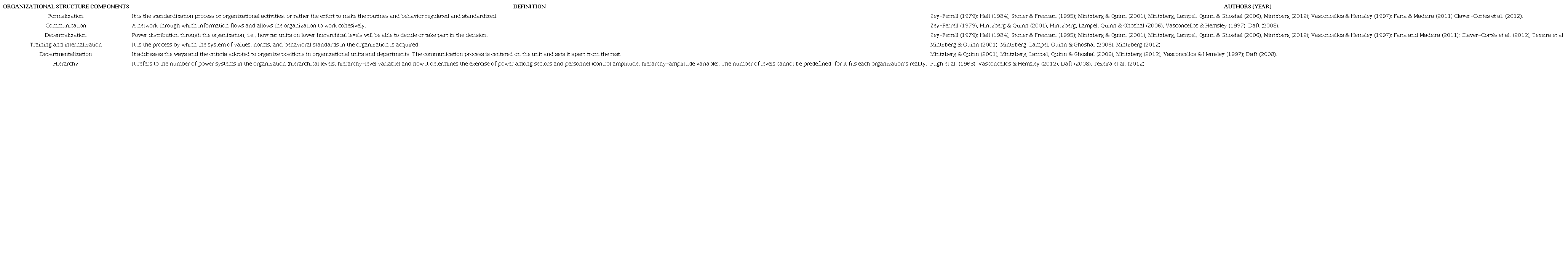 The definition of the components to be analyzed is based on Trigueiro-Fernandes (2014) and Trigueiro-Fernandes et al., (2016). These studies relied on six components to define a structure and on Mintzberg’s (2012) contingency theory as a theoretical framework. The nine design parameters were specifically adapted and defined by Mintzberg et al. (2006) into six structure components.
