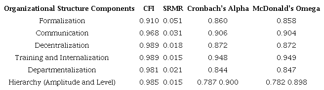 Through Confirmatory Factor Analysis, we found that the Scale of Organizational Structure Components (SOSC) achieved goodness of fit, which was assessed through the evidence of its validity. Also, we found that the scale fits the theory, according to the convergent validity criteria and composite reliability by Pasquali (1997) and Marôco (2010), and the discriminant validity by Fornell and Larcker (1981).