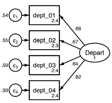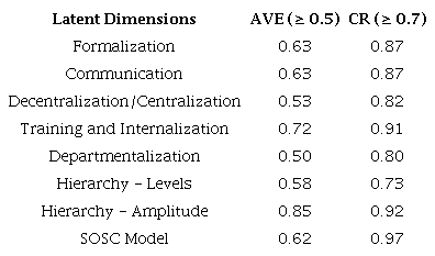 The SOSC model met the adjustment requirements proposed by Marôco (2010) by presenting all the AVE values equal to or greater than 0.5, as indicated in Table 4, except for the latent dimension concerning “departmentalization,” which had a borderline value of 0.498. In addition, the SOSC model also showed a composite reliability value of CR > 0.7, confirming the consistency of the variables with their respective factor.