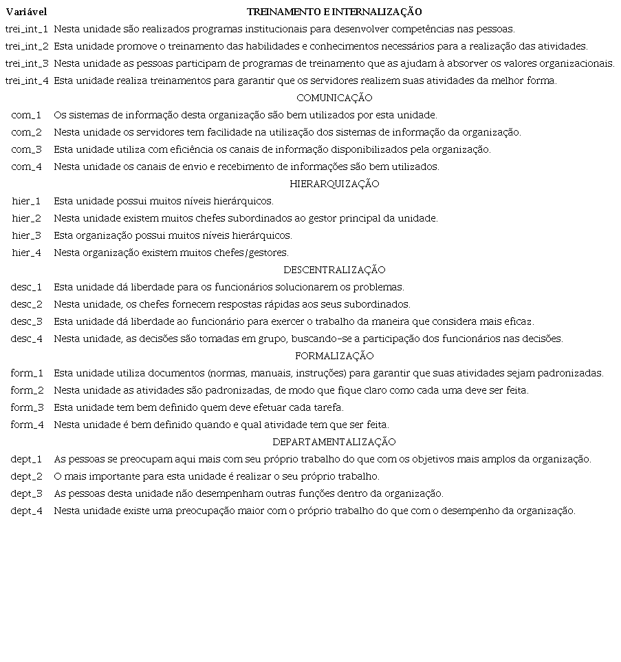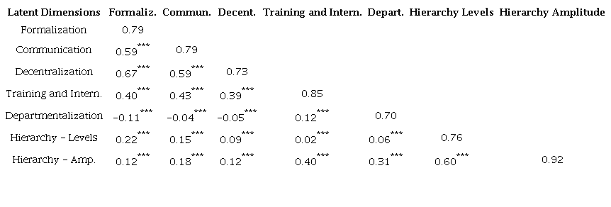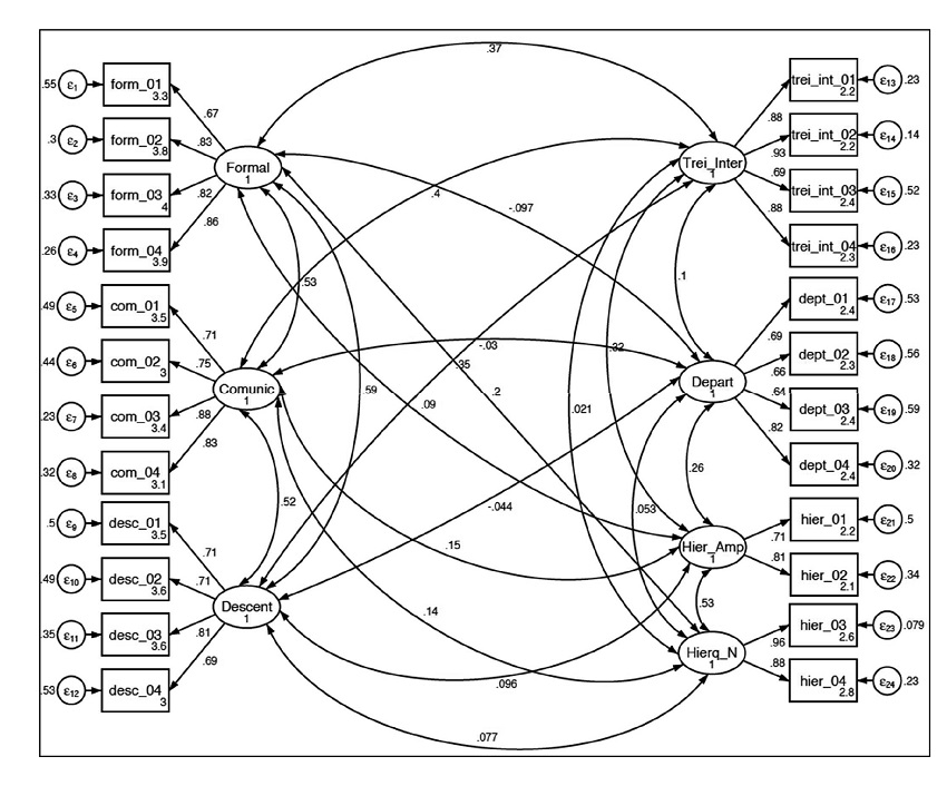 The model specified in this research, which adopted the exploratory results pointed out in the study by Trigueiro-Fernandes (2014), is comprised of seven latent dimensions that are organized into six design parameters from the Organizational Structure adapted by Mintzberg (2012): formalization; communication; decentralization; training and internalization; departmentalization; hierarchy (divided into the dimensions named hierarchy-amplitude and hierarchy-levels), and their respective observable variables.