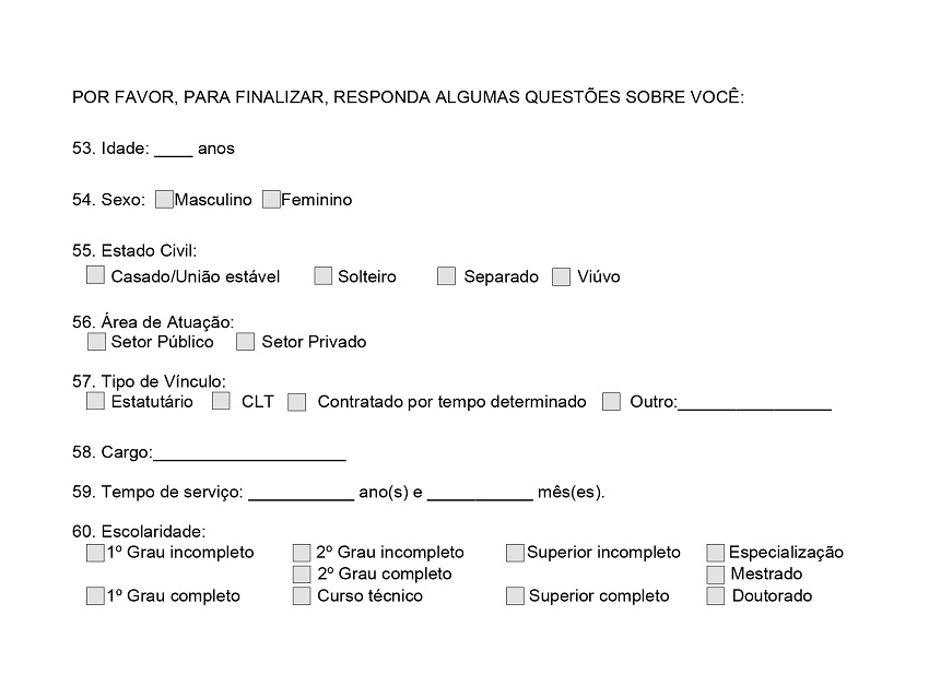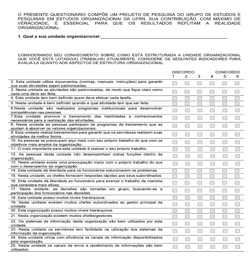 The survey consisted of four questions for each one of the six components, totaling 24 closed questions about Organizational Structure, as identified by Trigueiro-Fernandes (2014). The questions used the 6-point Likert scale as metrics, and its ends were “totally agree” and “totally disagree.”