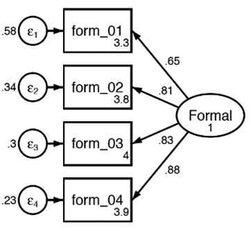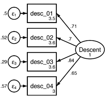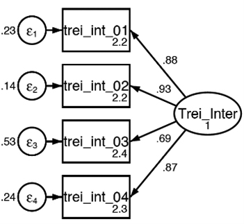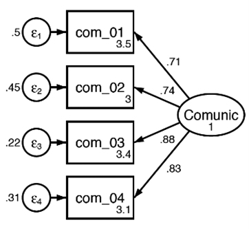 The adjustment indexes shown in Table 3 assess the model’s quality; for example, the X2/df was 4.57. On the other hand, the SRMR index had a value of 0.047, indicating low error representativeness and, thus, a superior model adjustment. In general, most of the values are considered robust by literature (Tabachinick et al., 2007; Marôco, 2010).
