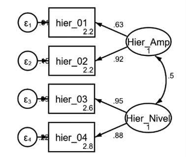 As previously discussed, hierarchy was addressed in two latent dimensions (hierarchy-levels and hierarchy-amplitude) since it enables superior theoretical adequacy and interpretation of results. Thus, as expected, the correlation between the two dimensions, hierarchy-levels, and hierarchy-amplitude, was one of the highest in the model, corroborating the idea that they constitute a single factor. Indeed, even when tested as a single factor, they have an acceptable Cronbach’s alpha.