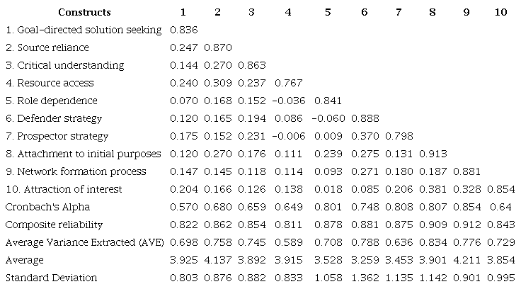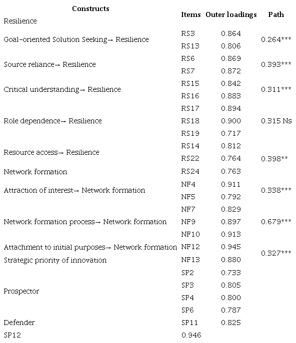 The constructs resilience and network formation were modeled as second-order reflective-formative. By including first and second-order constructs in the same model, the recommendations of Edwards (2001) were followed, which, in addition to enabling reflective testing with these constructs and their dimensions, assists in specific formative validations. The second-order constructs were analyzed in the form of repeated indicators, in order to identify the effects of the first-order construct on the higher-order construct. In structural validation, the two-stage approach was adopted to estimate the path coefficients of the higher-order constructs (Hair et al., 2014).