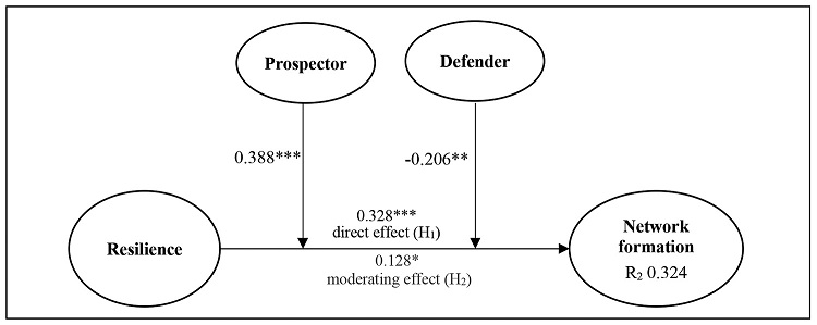It is noticeable that hypothesis H1, that manager resilience is positively associated with network formation, is supported (0.328, p<0.000, R2=0.107, F2=0.120). These results indicate that managers who are more resilient when faced with instability and changes in their companies can enhance their competitive capabilities, to the extent that they can identify and attract new partners in order to contribute to network formation.