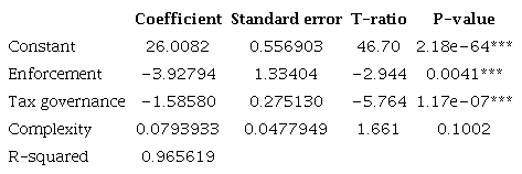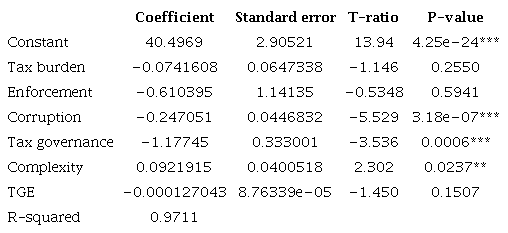 These results show that, with the adjustments made, tax governance continues to present significance, while complexity no longer does. It was also confirmed that the variables corruption and enforcement have the same explanatory power. This model indicated an R-squared value of 0.9656.