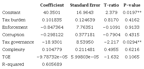 Only the variables enforcement and tax governance presented the expected behavior. This behavior already indicates an important finding of the research, since it reveals that tax burden and complexity-indicated by the literature to be important determinants of tax evasion-do not present the expected behavior when analyzed with a larger set of countries and in the presence of determinants such as enforcement and tax governance.