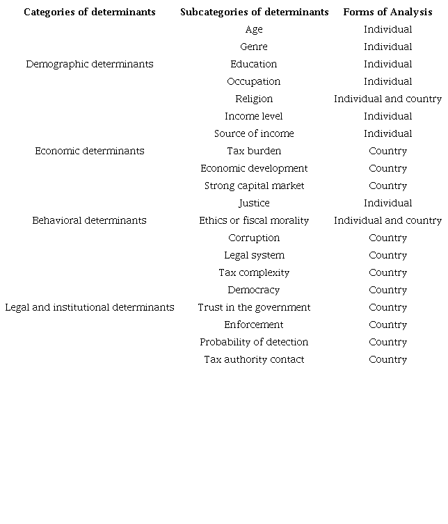 Assuming that tax evasion derives from an agency problem, it is possible to identify and verify which factors influence this phenomenon. In the specific case of tax evasion, studies on the subject have revealed the existence of several subjective, objective, economic, and non-economic factors, which are intertwined and mutually connected (Wallschutzky, 1984) and differ from one country to another (Kirchler, 2007). In this context, Jackson and Milliron (1986) proposed that the presence of tax evasion is associated with factors called determinants according to relationships investigated in previous research.