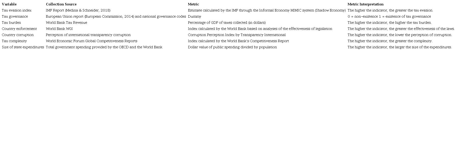 The first major literature review on the factors related to tax evasion was laid out by Wallschutzky (1984) and consolidated by Jackson and Milliron (1986). These elements can be analyzed both individually (firm/taxpayer data) and nationally (country data). However, although the methodological contribution was significant, the results from individual variables did not prove particularly useful for the analysis of general taxation policies, as the models considered only the actions of taxpayers (Hji Panayi, 2018). This led to the emergence of national approaches based on the metrics of tax evasion measurement constructed at the country level (Riedel, 2018). Table 1 consolidates the categories for these variables.
