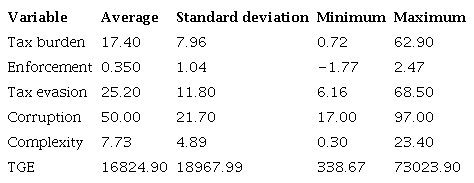 Our analysis of 90 countries represents a significant sample size-up compared to other benchmark studies on tax evasion, such as the 32 countries examined by Desai et al. (2007) and the 45 countries examined by Richardson (2006). The study has also used control variables, namely: tax burden, country enforcement, country corruption, tax complexity, and size of state spending (per capita). Table 4 summarizes the model variables, source of collection, metrics, and their respective interpretations.