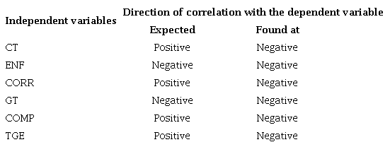 In this case, there is evidence of collinearity between corruption and enforcement. In these circumstances, the model can dispense with one of the variables, since their information set is similar. Table 7 contains a summary of the directions found and compares them with those expected.