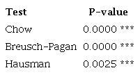 The Chow test was used to choose the best alternative between the pooled model and the fixed effects model. In this case, this test allowed us to reject the null hypothesis of parameter stability since the p-value was 0.0000, which is lower than the 5% significance level. It can then be concluded that there is a structural change in the data, so the fixed effects estimation is better than the pooled model (Ordinary Least Squares-MQO).