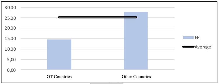 As for tax evasion, the countries from the sample have been divided into two groups: those with tax governance (GT countries) and those without (other countries). This grouping allows us to determine that for the observed period, the average tax evasion of the other countries is higher than the average for the entire sample, whilst that of the GT countries is below the overall average Tax evasion - EF (Figure 2).