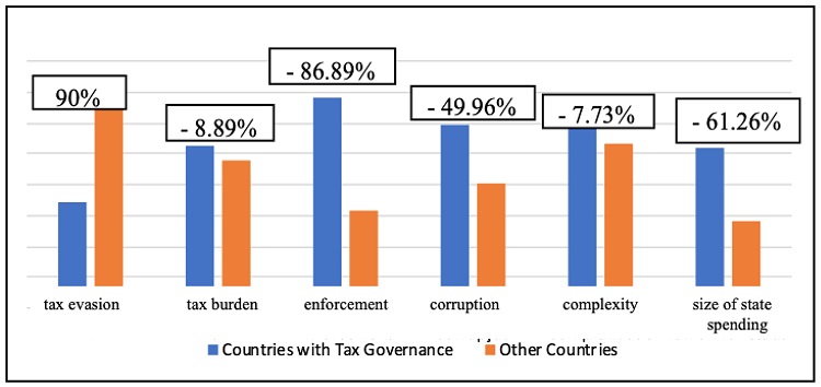 One can see that the average level of tax evasion in countries without tax governance is 90% higher than in countries with tax governance. For all other variables, the countries without tax governance present lower average indexes-especially for enforcement, with a difference of 86.89%.