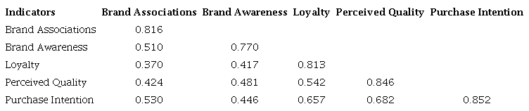 The first criterion analyzed was internal consistency, which uses Cronbach’s alpha values and composite reliability as parameters for validation. As recommended by Hair Jr. et al. (2017), all constructs had Cronbach’s alpha above 0.708 and composite reliability below 0.95. However, some indicators showed below-recommended external load values (<0.708) and the indicator confidence values below the minimum (<0.5). Therefore, the indicators correspondent to those values were excluded from the analysis, namely AW05, AS01 and AS02 (one indicator of the Brand Awareness construct and two of the Brand Associations construct). The exclusion of these indicators is justified by the positive impact on the construct validity by checking the stroke and composite reliability indices, as indicated by Hair Jr. et al. (2017). In addition, all constructs met the discriminant validity criteria as indicated in Fornell-Lacker’s test results (Table 1).