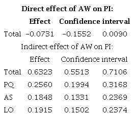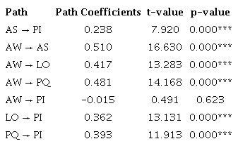 The second stage of the analysis consisted of evaluating the significance and relevance of the path coefficients of the structural model. The relationships between Associations (AS), Loyalty (LO) and Perceived Quality (PQ) constructs with Purchase Intent (PI) construct showed a relevant level of significance (1%). The relationship between Consciousness (AW) and Purchase Intention (PI) constructs was not significant, as presented in Table 2. When analyzing the value of the path coefficient of this relationship, it has a negative value close to zero. On the other hand, the effect of brand awareness as antecedent of the variables: associations, perceived quality and loyalty was significant.