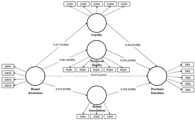The findings demonstrate that there is a direct and significant relationship between CBBE dimensions (perceived quality, loyalty, and associations) and purchase intention, which resembles previous studies (Ranjbariyan et al., 2012; Calvo-Porral et al., 2015; Kim & Kim, 2005; Jyothsna et al., 2016; Calvo-Porral & Lévy-Mangin, 2017). On the other hand, the fact that brand awareness does not directly impact purchase intent differs from previous studies that demonstrated a direct positive relationship (Keller, 1993; Wu & Ho, 2014; Akkucuk & Esmaeili, 2016).