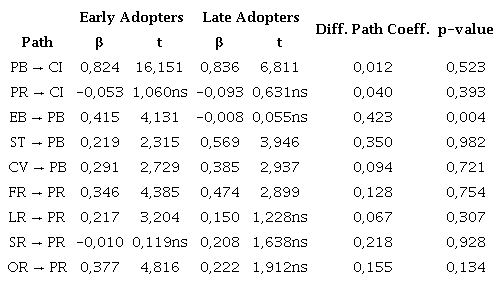We can conclude that the only factor whose difference was statistically significant between the groups was economic benefit, which was important for early adopters and not significant for late adopters (difference in the path coefficient=0.423, p<0.05).