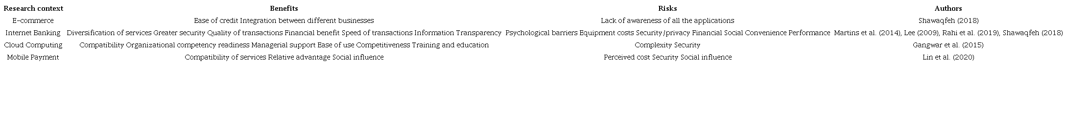 Table 1 illustrates previous studies that have analyzed the framework of the decision-making process, when adopting or using information technology services (Shawaqfeh, 2018; Martins et al., 2014; Lee, 2009; Rahi et al., 2019; Gangwar et al., 2015; Lin et al., 2020). Most of these studies have considered perceived benefits and risks as a multidimensional concept that generally contains various types of benefits and risks.