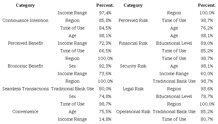 According to the results of the research based on the decision tree analysis, decision trees were generated for each one of the factors perceived in the theoretical model and the demographic variables (sex, age group, income range, use of financial services of traditional banks, time of use, and region). Table 3 presents the results of the analysis, showing which demographic variables were most used for each factor of the model.