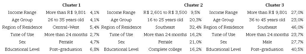 With relation to cluster 2, it can be observed that the percentages of the predominant variables are, respectively: income range between R$ 2601 and R$ 3500 (9.64%), followed by the income range R$ 4401 to R$ 6200 (8.78%); residents in the Southeast region (32.43%), followed by the South region (6.76%); time of use of less than 18 months (10.14%) and more than 2 years (16.22%); age group between 16 and 25 (20.27%) and between 26 and 35 (16.68%); male (18.24%) and female (20.95%); complete college education (12.84%) and complete high school education (16.22%).