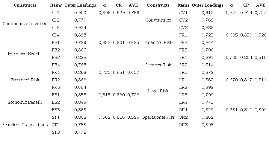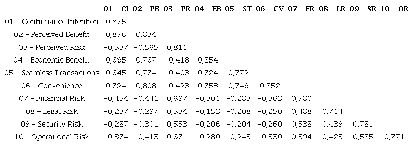 The final analysis was the discriminant validity (DV) calculation using the Fornell-Larcker criterion (Table 6), which compared the square root of the AVE values of each factor with the correlation between the factors: for each factor, the square root of the AVE of each factor, present on the diagonal of the table below, should be greater than the factors presented in their column (Hair Jr. et al., 2014). In this case, there was a problem in the test, as the continuance intention and perceived benefit factors present a possible multicollinearity problem. However, the following tests did not present improvements in the model and, as the other validity and consistency factors presented good results, we decided to keep the proposed model.