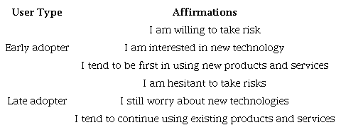 The distinctions between early and late adopters in the financial sector are more significant than in other sectors. A comparison of the characteristics of early and late adopters may provide researchers and professionals with valuable insights. The model is based on the following hypotheses in relation to the different types of users: