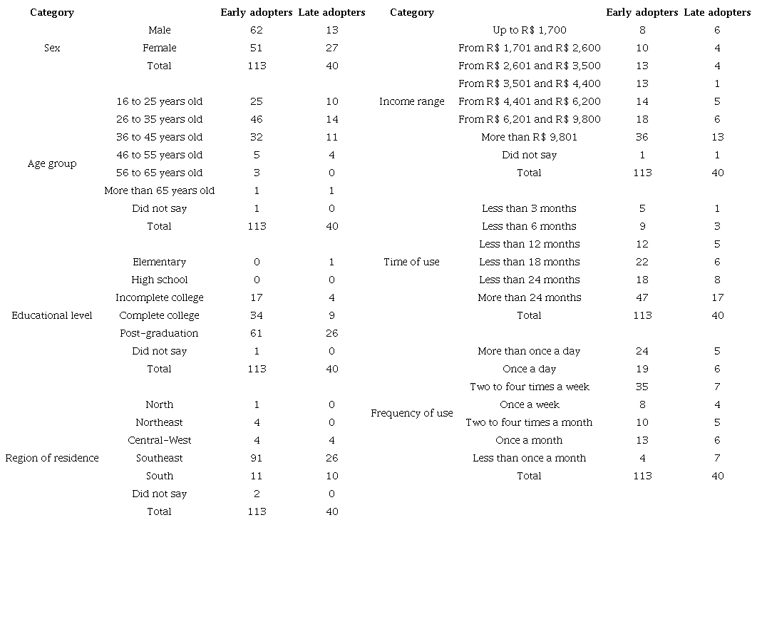 When an innovation is launched onto the market, not all individuals in that society adopt it simultaneously. The period that each one takes to adopt that innovation can vary due to several factors. Rogers (1983) classified individuals into five categories, according to the time that each one takes to start using a particular innovation. They are: innovators, early adopters, early majority, late majority, and laggards. From studying factors that influence users to adopt mobile payment systems, Kim et al. (2010) proposed a simplification of that model, dividing the sample of users into early adopters and late adopters. In this study, we will adopt the model proposed by Kim et al. (2010), dividing the survey respondents into early and late adopters.