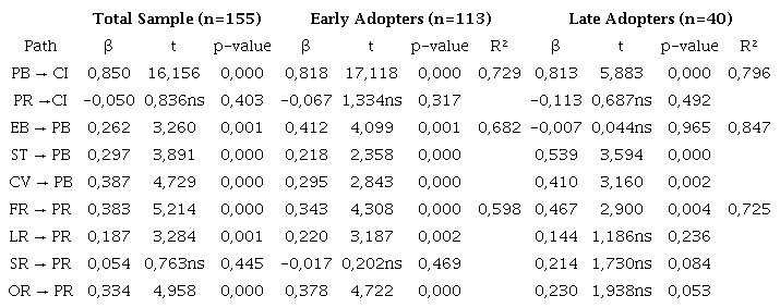 In relation to perceived risk, the operational risk factor was the most important for the early adopters (β=0.378, p<0.05). For the late adopters, the most relevant factor was financial risk (β=0.467, p<0.05).