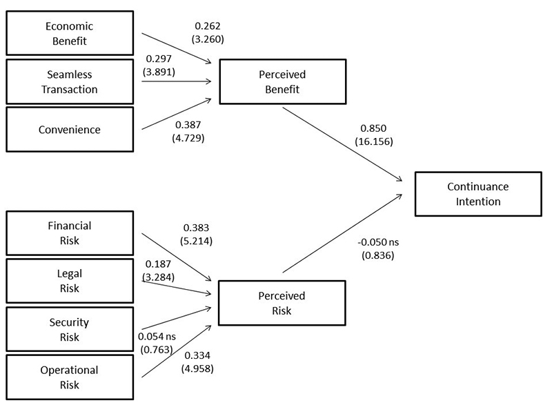 Both for early users (β=0.818, p<0.05) and for late users (β=0.813, p<0.05), perceived benefit was important for continuance intention. In both cases, however, perceived risk was not significant. For early adopters, the most important factor for explaining their perception of benefit was economic benefit (β=0.412, p<0.05). For late adopters, this factor was not significant, with seamless transactions being the most important factor (β=0.539, p<0.05).