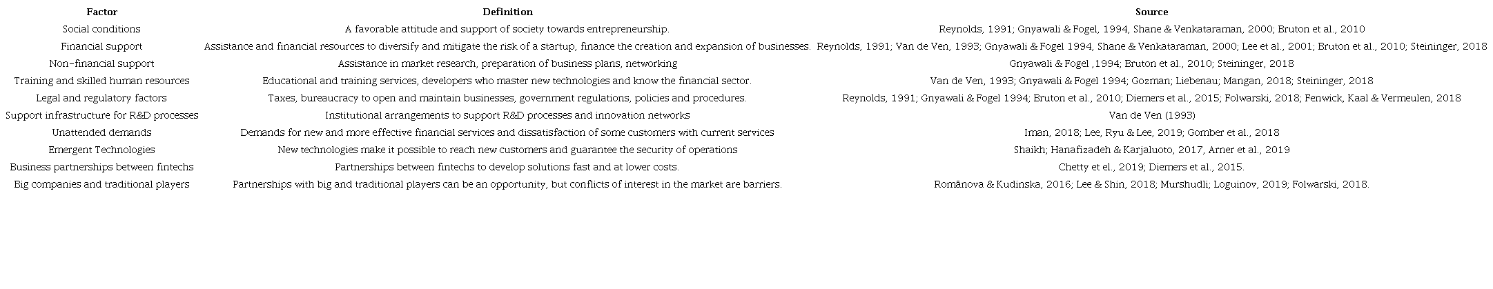 The general entrepreneurship literature points to supporting factors and infrastructure necessary to promote the entry and development of new companies and startups (Reynolds, 1991; Van de Ven, 1993; Gnyawali & Fogel 1994, Shane & Venkataraman, 2000; Bruton et al., 2010). However, there is a lack of studies specifically addressing these factors concerning fintechs, particularly by analyzing their insertion and development in the Brazilian context, which motivated this article.