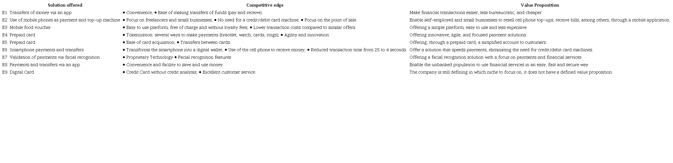 Initially, the managers of the fintechs were asked about their companies’ differentials and value proposition. Chart 2 shows that, except for E9, they have a clear value proposition and focus on specific segments and niches in the Brazilian market.
