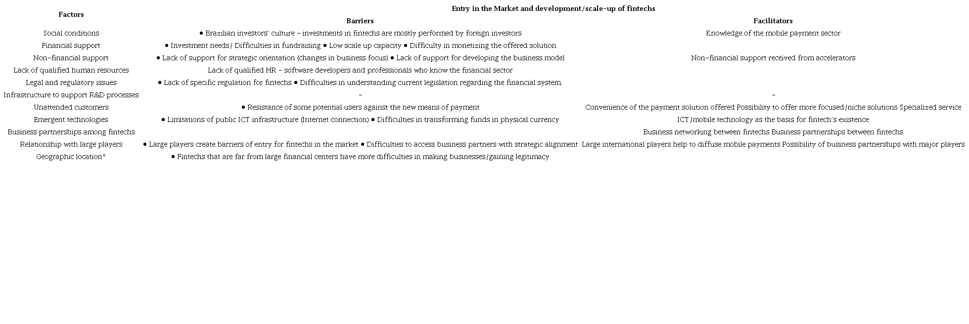 The categories, as they emerged from the data, made it possible to understand the profile of the mobile payment fintechs, their history of entry in the market, and their development, as well as facilitators and barriers faced in these processes. These categories were crossed with the categories pointed out by the literature (section 2) later in the process.