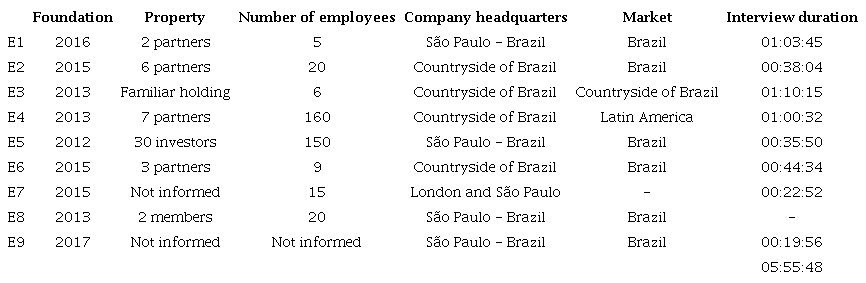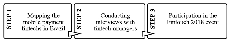 Step 1: Mapping the mobile payment fintechs in Brazil - To identify the mobile payment fintechs operating in Brazil, an advanced Google search for the term “mobile payments” was carried out on November 30th, 2017, and we considered the first 30 pages of results, corresponding to 300 websites, which were analyzed. In this analysis, a fintech radar publication was found, published in November 2017, by FintechLab, a hub for connecting and promoting the Brazilian fintech ecosystem. With the radar in hand, we searched for information from the fintechs in the payment sector depicted in the radar to identify those that offered mobile payment solutions. We performed this search via social networks (Facebook and Instagram) and in the companies’ websites, identifying 34 mobile payment fintechs. The first contact with these 34 companies occurred via e-mail or Messenger; a letter presenting the research was sent, and an interview was requested. During the interviews, we searched for contact with other companies, following the snowball technique. Of all the contacted companies, nine agreed to participate in this research.