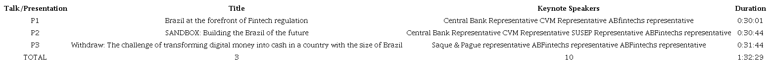 Step 3: Participation in the Fintouch 2018 event - The Fintouch is the largest Fintech event in Latin America. It happened in August 2018, in São Paulo (Brazil); the first author of the paper attended 35 talks/presentations in this event, and 3 were selected for recording (with a total duration of 01:32:00). These talks/presentations addressed topics directly related to the research. Table 2 presents the details of the data collection performed at this event.