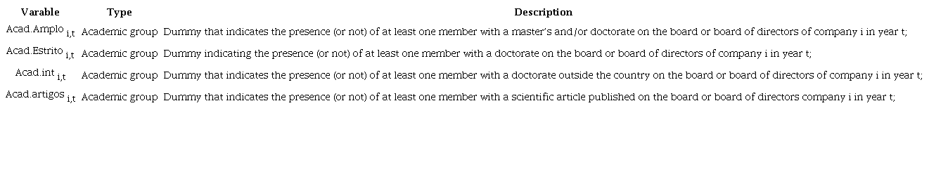 The choice of dependent variables also reflects the academic details of the career of the members of the boards and boards of directors. In contrast to the current literature, we use several definitions that take into account the different academic titles and the scientific production of each participant. Variable Acad.inti,t is original and reflects results already found in the literature on the scientific production of Brazilian researchers (Perlin et al., 2017). According to the aforementioned study, on average, professors with doctorates outside of Brazil have scientific production of greater impact. The justification for the inclusion of the variable in the research in question is, therefore, to verify if this higher productivity is also found in the corporate world and whether the location of the doctorate is a positive sign for the potential of academics in the corporate world.