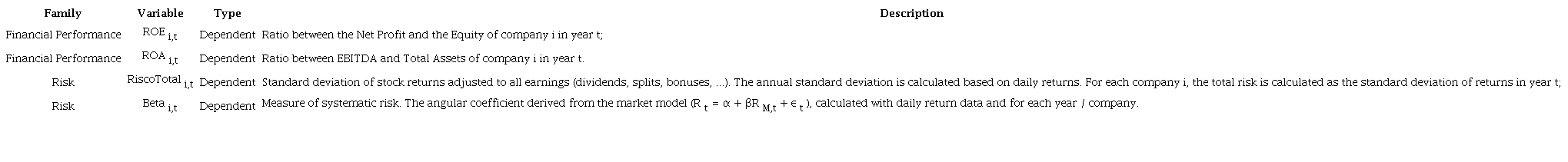 Variables Desempenhoi,t e Riscoi,t are defined as follows - Table 3:
