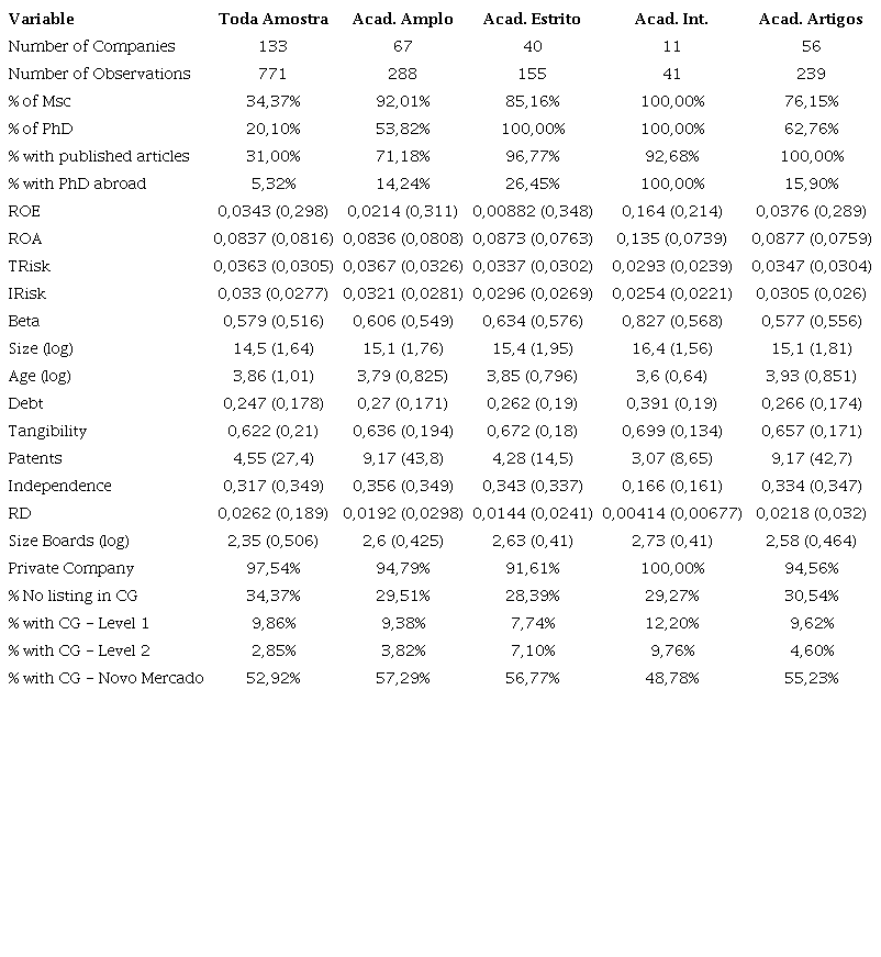 Analyzing first the descriptive statistics of the sample formed by companies-years that had at least one master and/or doctor on the board and/or board of directors (Acad. Amplo), that is, using a broader definition of the academic term, we can observe that only 67 companies (288 observations), out of a total of 133, are responsible for hiring academics for these positions.