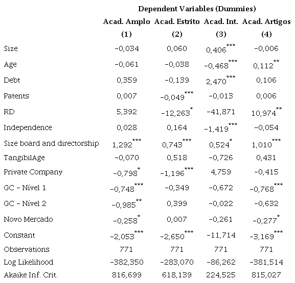 In the last model, the presence of academics with articles published in scientific journals on the boards and boards of directors in Brazilian companies, we find the expected result that Idade, RD, Tamanho do conselho e diretoria positively affect the presence of board members and directors with scientific publication, that is, the profile of contractors is older companies, with larger boards and with significant investment in research.