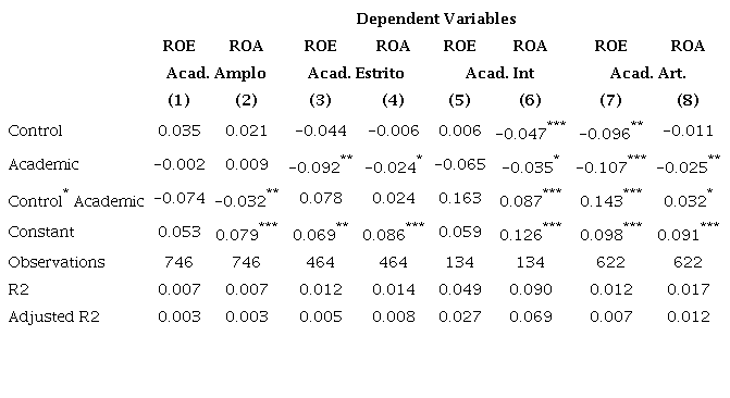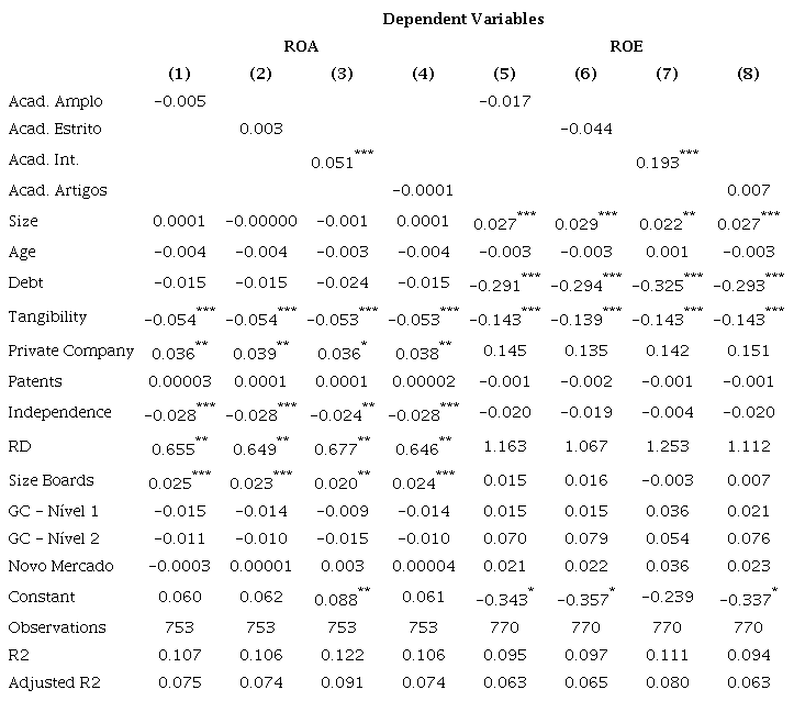 The absence of significant effects when using more comprehensive measures of the presence of academics on the boards and boards may have several reasons. We will list here two of them that we believe to be the most promising. First, according to the theory of the upper echelons (see especially Hambrick, 2007), the ability of executives to change strategic directions and impact organizational performance can be limited by a series of formal and informal constraints on the external and internal environment. As in the Brazilian capital market there is still a predominance of firms with concentrated, or family, control and, as these companies tend to be more conservative, the space for changes on the part of board members and directors with higher academic training can be quite limited. In this line, the trend of young firms, therefore, is to be more dynamic, more receptive to innovation, and with greater freedom of action for their executives. Hiring academics with a doctorate degree from abroad could also explain the positive effect on profitability found when we adopted this measure more restricted from the presence of academics. For future research, we suggest that the effect of academic training on performance is moderated by variables that capture the discretion of managers and advisors.