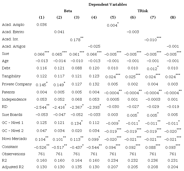 In order to continue the analysis, Table 6 shows the results of our model number 3. Unlike the results found by Francis et al. (2015), in general, the compiled results do not provide statistically significant and majority evidence that the unrestricted presence of doctors, masters and members with published scientific article can affect the profitability and risk of the companies studied. Thus, in our sample, we did not obtain sufficient evidence to allow us to confirm our first hypothesis (H1). The only case with a positive sign and statistical significance was for Acad. Int, which will be discussed shortly after, in our hypothesis H3.