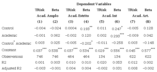The term Controlei,t is a dummy that takes value one when company i belongs to the control group (academics) and zero when the company is a pair selected by minimizing the difference between scores. Variable Acadi,t is also a dummy and identifies the years in which company i had academics on its boards and boards of directors, following the different classifications: Acad.Amplo, Acad.Estrito, Acad.Int. and Acad.Articles. The coefficient of interest is β3, which will indicate, controlling for other variables, the isolated effect of the presence of academics on the boards and boards on the performance and risk of companies.