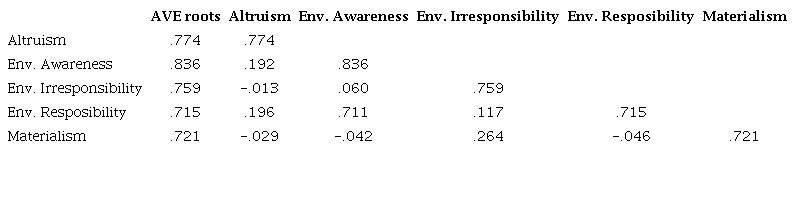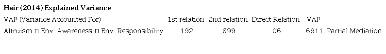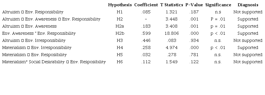 Analyzing the structural equation model, we observed the relation of altruism-environment responsibility was not significant, rejecting H1 (Altruism tends to have a positive relationship with environmental responsibility). We confirmed H2 (Environmental awareness mediates the positive relation between altruism and environmental responsibility), with H2a (Altruism has a positive and direct relation to environmental awareness) (p<.05) and H2b (Environmental awareness has a positive and direct relation to environmental responsibility) (p<.01). We performed the calculations to test mediation according to the guidelines of Hair Jr. (2014) combined with SmartPLS 3 software, as can be seen in Tables 5 and 6, respectively. We did not confirm H3 (Altruism tends to have a negative relationship with environmental irresponsibility).