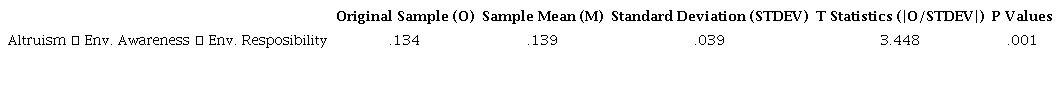 Our findings complement the findings of Xu et al. (2019), and Zhang et al. (2019), that state altruism alone does not motivate environmental responsibility. First, there must be environmental awareness. Thus, we understand that the individual only becomes environmentally responsible if he or she is also environmentally conscious.