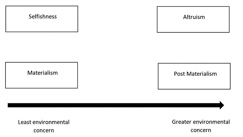Analyzing values toward pro-environmental attitudes and behavior, Stern, Dietz, and Guagnano (1995) argue that individuals who are more concerned with the environment tend to be more altruistic or more socially friendly. In analyzing these values, Inglehart (1990) denotes that materialistic individuals give greater value to their possessions and material goods to achieve their life goals (Belk, 1984; Richins, 2004). In summary, we illustrate these characteristics, as proposed by Gilg, Barr and Ford (2005) in the model presented in Figure 1. This model suggests a continuum between opposite values, countering on the same scale selfishness and altruism, and materialism and post-materialism.