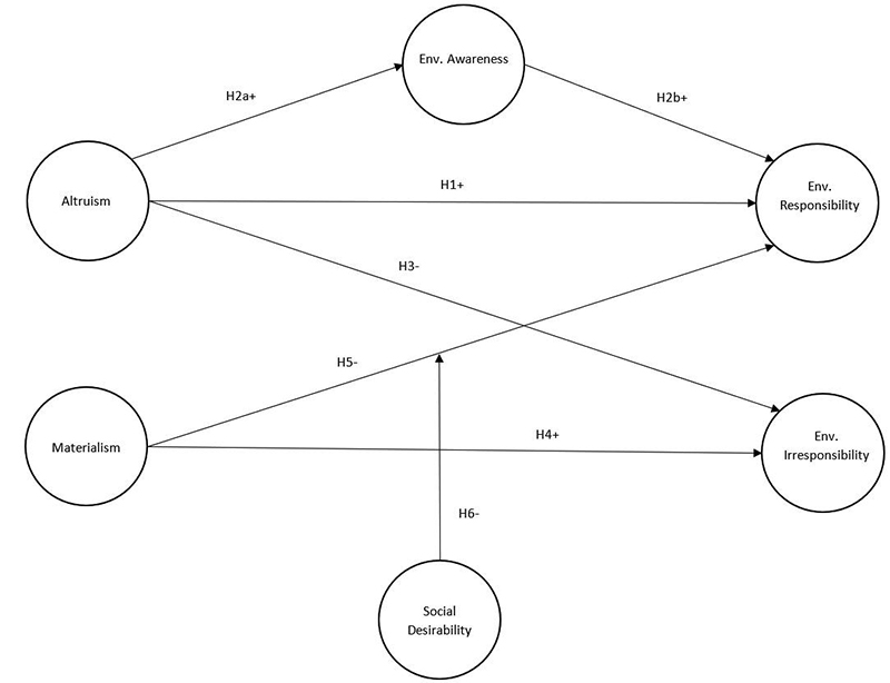 ABSTRACT: We investigated if altruism and materialism can explain attitudes related to the lower impact on the environment. This study aims to investigate the role of environmental awareness as a mediating variable between altruism and environmental responsibility, and if materialistic individuals can manifest environmental responsibility through social desirability. Also, we investigated the relations of altruism and materialism with environmental irresponsibility. Using the structural equations model, we analyzed the data from a survey with 339 individuals. The results conclude that altruism does not have a direct relationship with environmental irresponsibility, but has a relationship with environmental responsibility, not direct, but mediated by environmental awareness. Besides a direct relationship between materialism and environmental irresponsibility, we did not find a direct relationship with environmental responsibility, not even with the moderation of social desirability. This study shows values and attitudes that collaborate with pro-environmental behaviors, demonstrating the importance of environmental awareness for individuals to engage in actions favorable to sustainable consumption.
