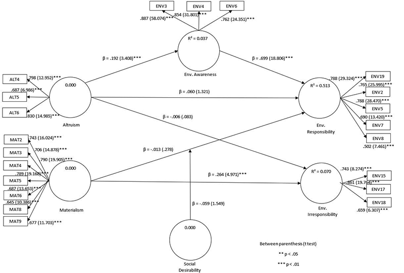 The relation of materialism-environment irresponsibility was significant, as exhibited in Table 5. Thus, we confirmed hypothesis H4 (Materialism tends to have a positive relationship with environmental irresponsibility). Conversely, we did not confirm the relation of materialism-environmental responsibility, rejecting H5 (Materialism tends to have a negative relationship with environmental responsibility). By including the social desirability variable as moderator, the relationship materialism-environment responsibility did not become significant, which involves rejecting H6 (Social desirability moderates the negative relationship between materialism and environmental responsibility, making that weaker), as shown in Table 7. Figure 3 presents the final structural model.
