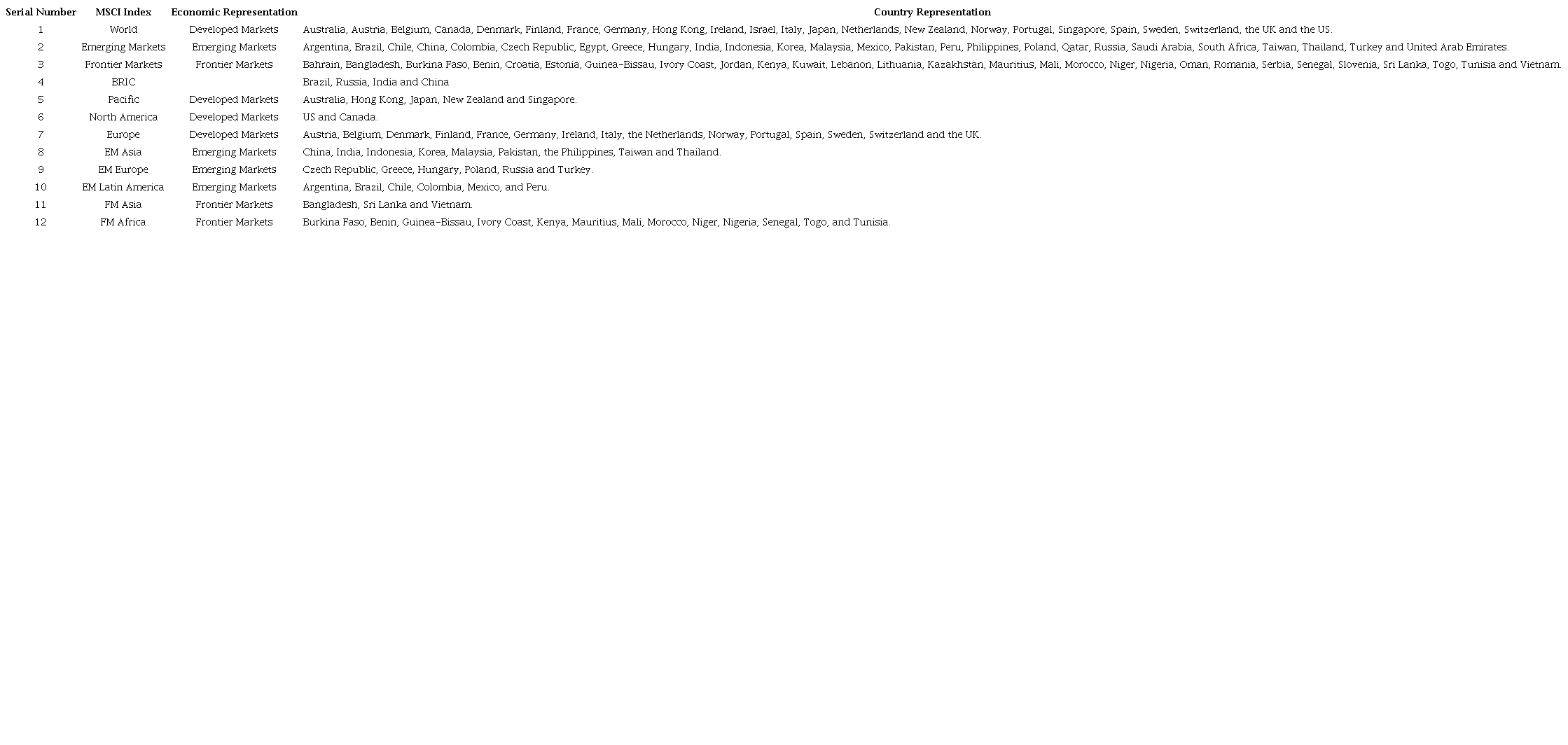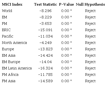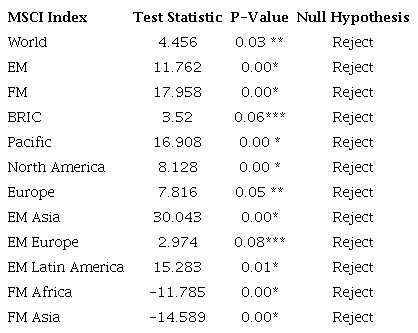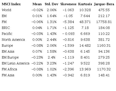 The summary statistics for the return data of the MSCI indices included in the study is presented in table 1. The World index was associated with a mean return of -0.02 percent and a standard deviation of 2.06 percent. The EM index and the FM index were associated with mean returns of 0.01 percent and -0.06 percent and a standard deviation of 1.64 percent and 1.31 percent respectively. Further, the BRIC index was associated with a mean return of 0.04 percent and a standard deviation of 1.71 percent. Among the indices which represented the developed markets, the Pacific, North America and Europe indices were associated with a mean return of -0.03 percent, 0 percent, and -0.08 percent and a standard deviation of 1.43 percent, 2.44 percent, and 2.06 percent respectively. Among the indices which represented the emerging markets, the EM Asia, EM Europe, and EM Latin America indices were associated with a mean return of 0.07 percent , -0.23 percent, and -0.22 percent, and a standard deviation of 1.58 percent, 2.41 percent, and 3.23 percent respectively. The FM Africa and the FM Asia index which represented the frontier markets were associated with mean returns of -0.08 percent, and 0 percent, and a standard deviation of 1.02 percent, and 1.43 percent, respectively. Thus, we observe that the mean returns for the indices under study exhibit a negative bias during the period under study with the exception of the EM, BRIC, and EM Asia indices. Further, we observe that the Index return data series shows excess kurtosis besides being negatively skewed. The return series is not normally distributed as apparent from the Jarque-Bera test statistics.